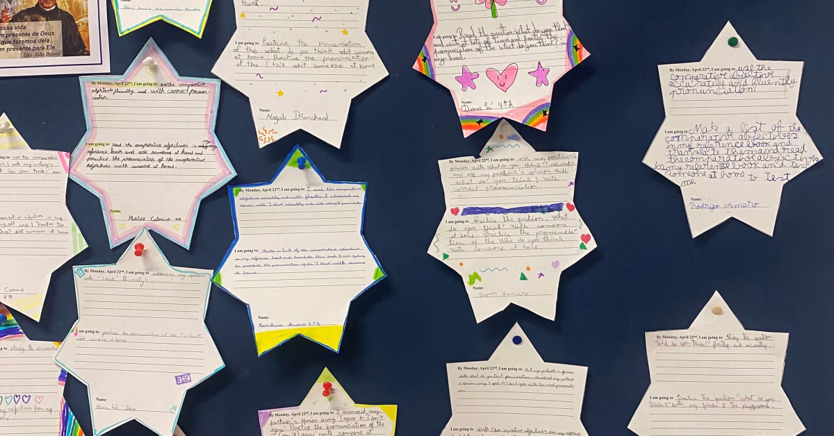 Our 4th year students have been exploring self-assessment and goal setting. After speaking activities, the students have been asked to analyse their strengths and weakness in a self-assessment form. Then, they’ve used these weaknesses to decide what they need to improve and how they’re going to improve. Students were given the challenge of choosing and implementing one or two learning strategies related to their objectives. The first time we tried this process, many students forgot to use their strategies and they were very disappointed! So, the next time we did self-assessment and goal setting, the students wrote their objectives and strategies on a star that was displayed on the classroom wall…  quite a few had remembered to use their learning strategy and many had asked their friends and family to help them! More importantly, many said they felt they had improved!